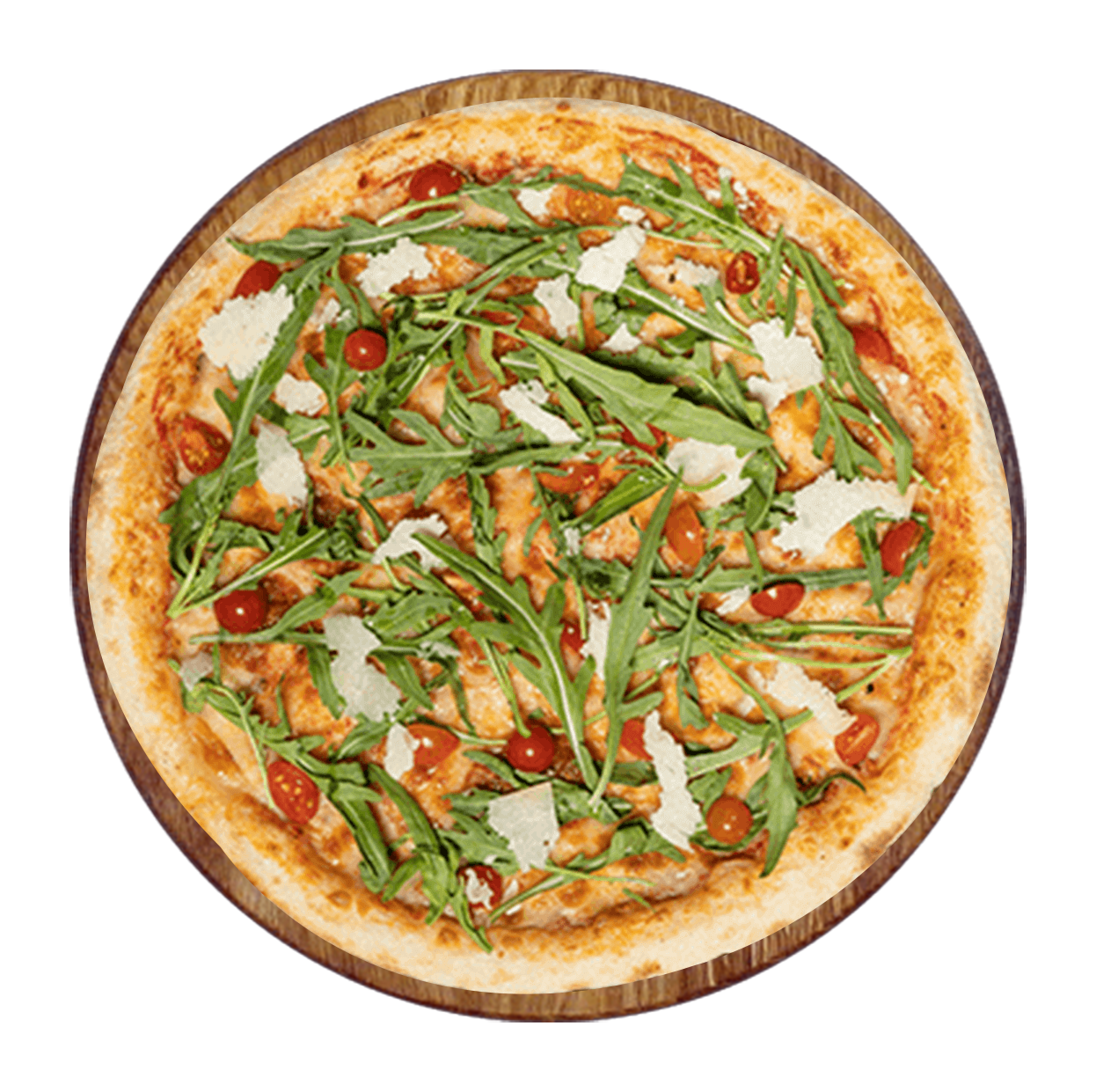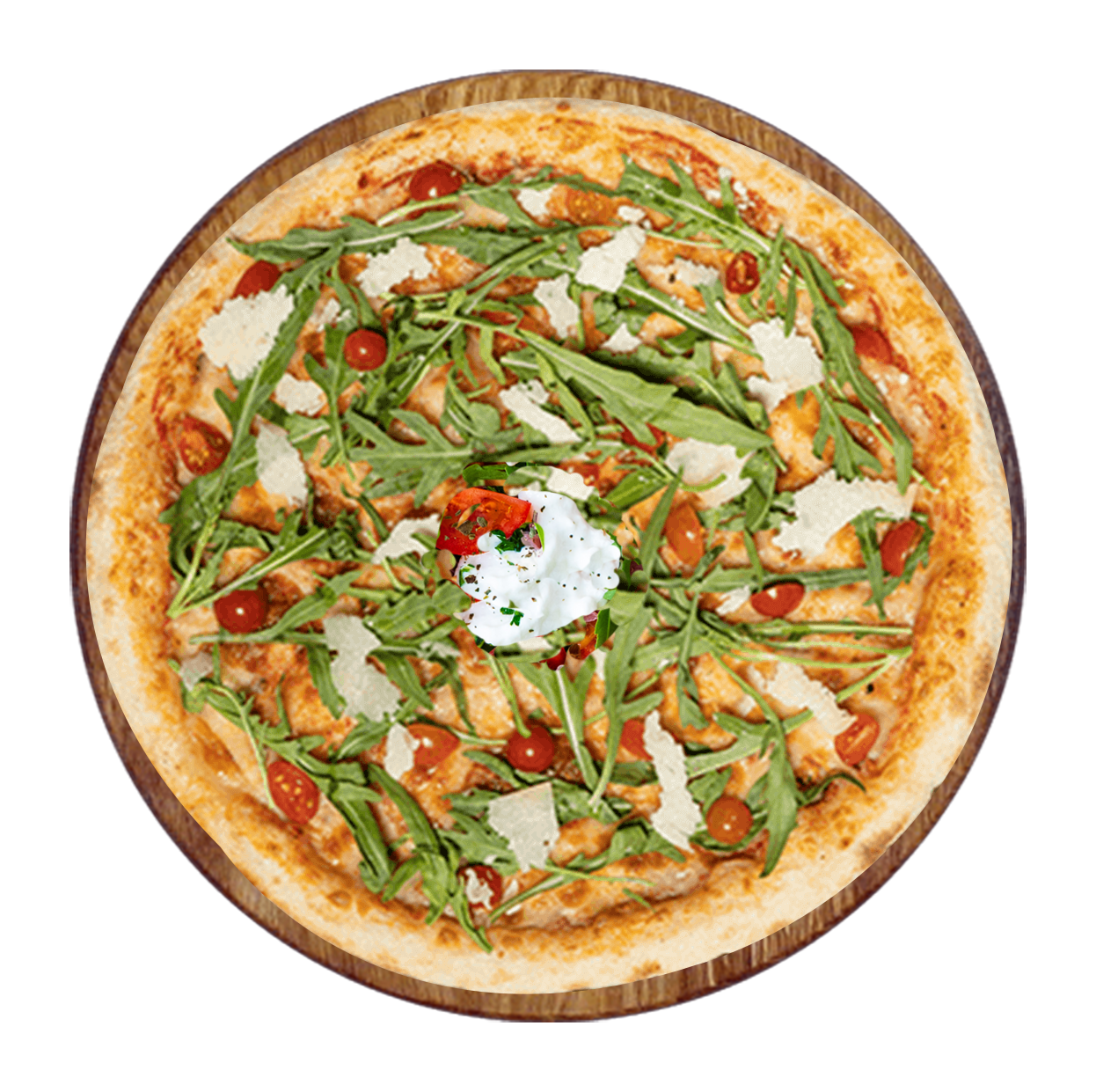 Sauce tomate, tomates cerises, roquette, burrata, basilic, huile d olive extra vierge, copeaux parmesan.